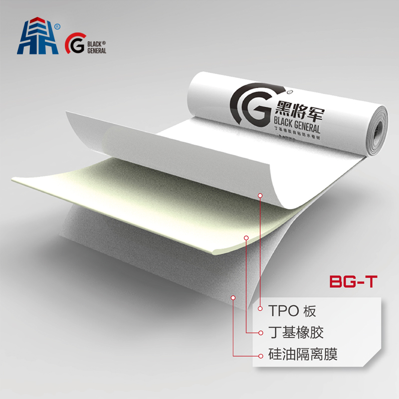 BG-T 丁基橡膠TPO自粘防水卷材是在TPO防水卷材上涂覆丁基橡膠自粘膠料,并覆以隔離層而組成的采用自粘法或濕鋪法施工的防水卷材。
